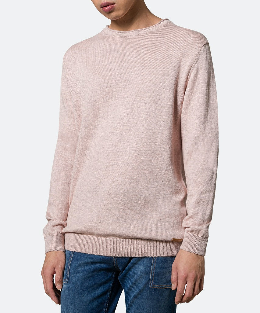 Locker geschnittener Strickpullover aus Baumwolle und Leinen. Fein melierte Optik, Rollkante am Rundhalsausschnitt, Rippstrickbündchen und Baldessarini Leder Badge über dem Saum.