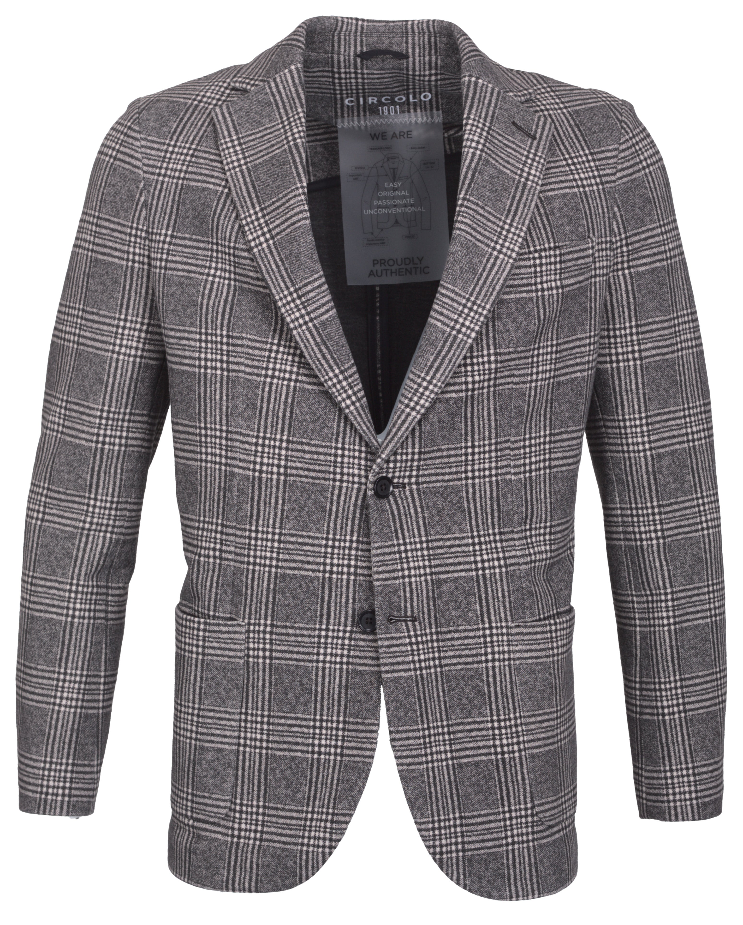 Dieses einreihige Jerseysakko von Cicolo verbindet klassischen Stil mit modernem Komfort. Hergestellt aus einem angenehmen Baumwoll-Elastan-Mix, bietet es Flexibilität und Bewegungsfreiheit. Das markante Glen-Check-Muster in Anthrazit und Ecru verleiht dem Sakko einen eleganten Look, der sowohl für formelle als auch legere Anlässe passt. Zwei aufgesetzte Taschen und zwei Rückenschlitze sorgen für zusätzlichen Komfort und Funktionalität. Zudem ist das Sakko waschbar, was es besonders pflegeleicht und praktisch für den Alltag macht.