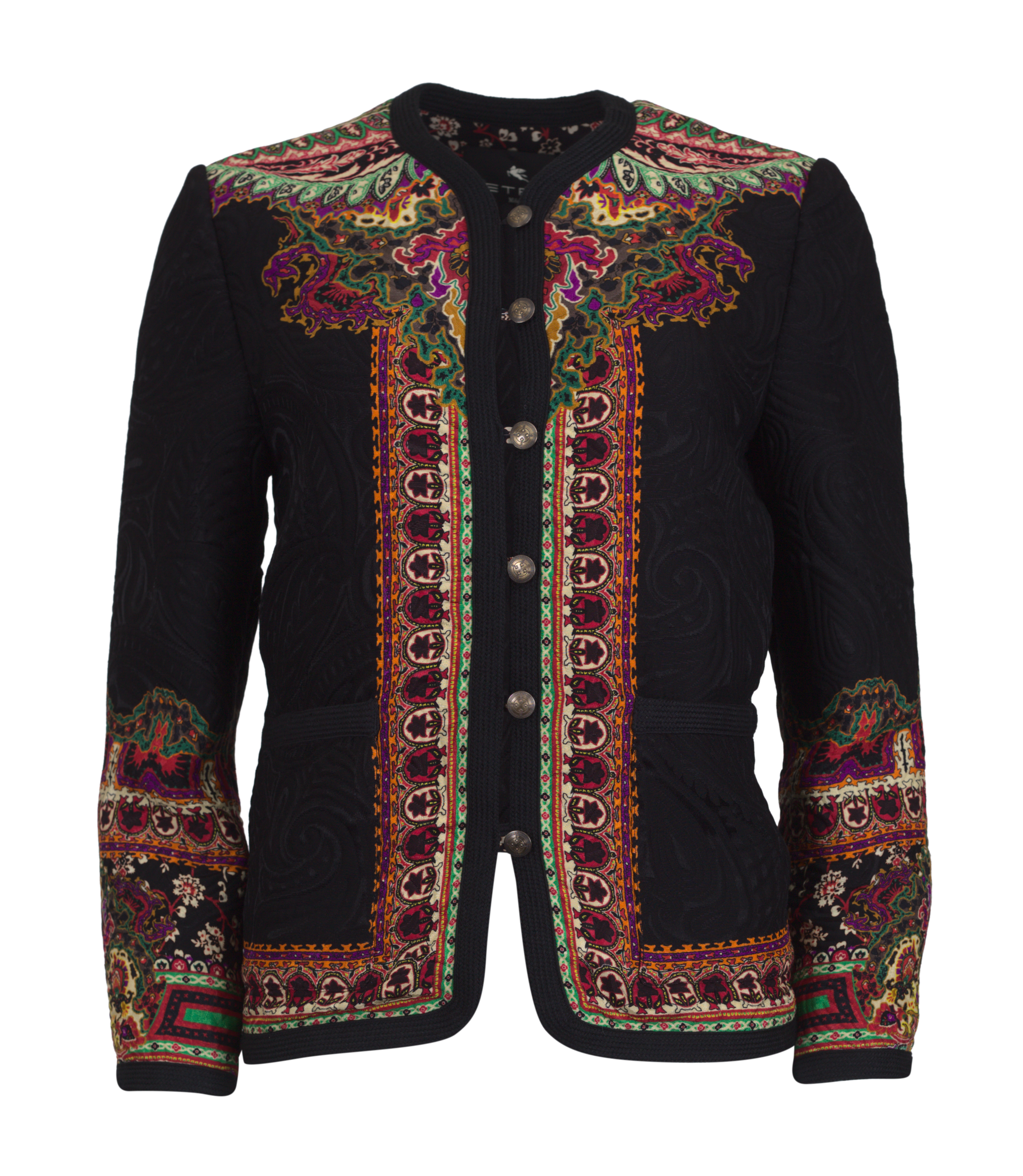 kragenlose Blazerjacke, Strickabschlüsse, Schmuckknopf, 2 aufgesetzte Taschen, Ton in Ton-Jacquard schwarz und bunte Paisley-Details