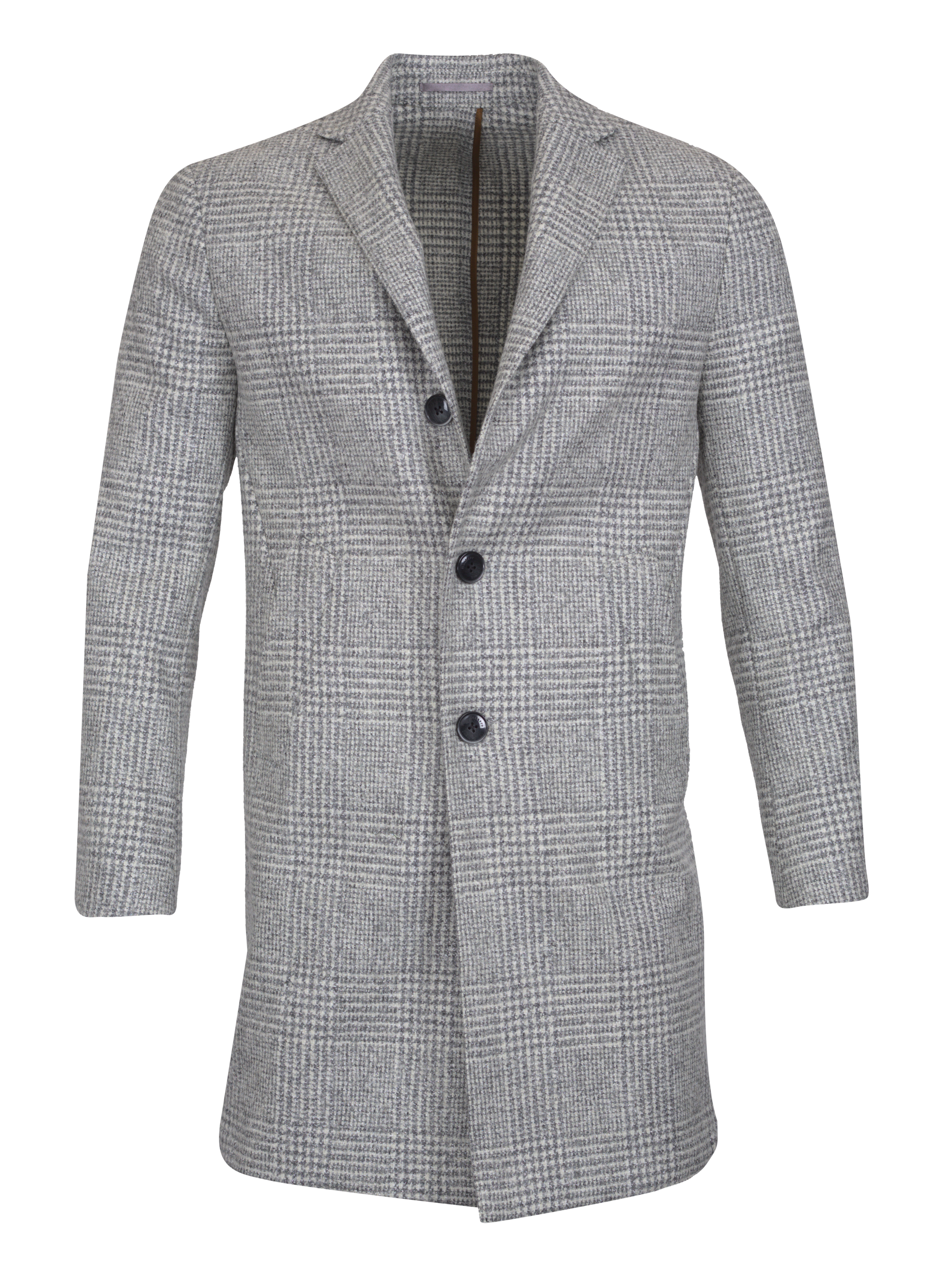 Wollmantel, Gerade Passform, Drei Innentaschen, Zwei Außentaschen, Gehschlitz, Knopfverschluss, Karo-Muster, Reverse-Kragen