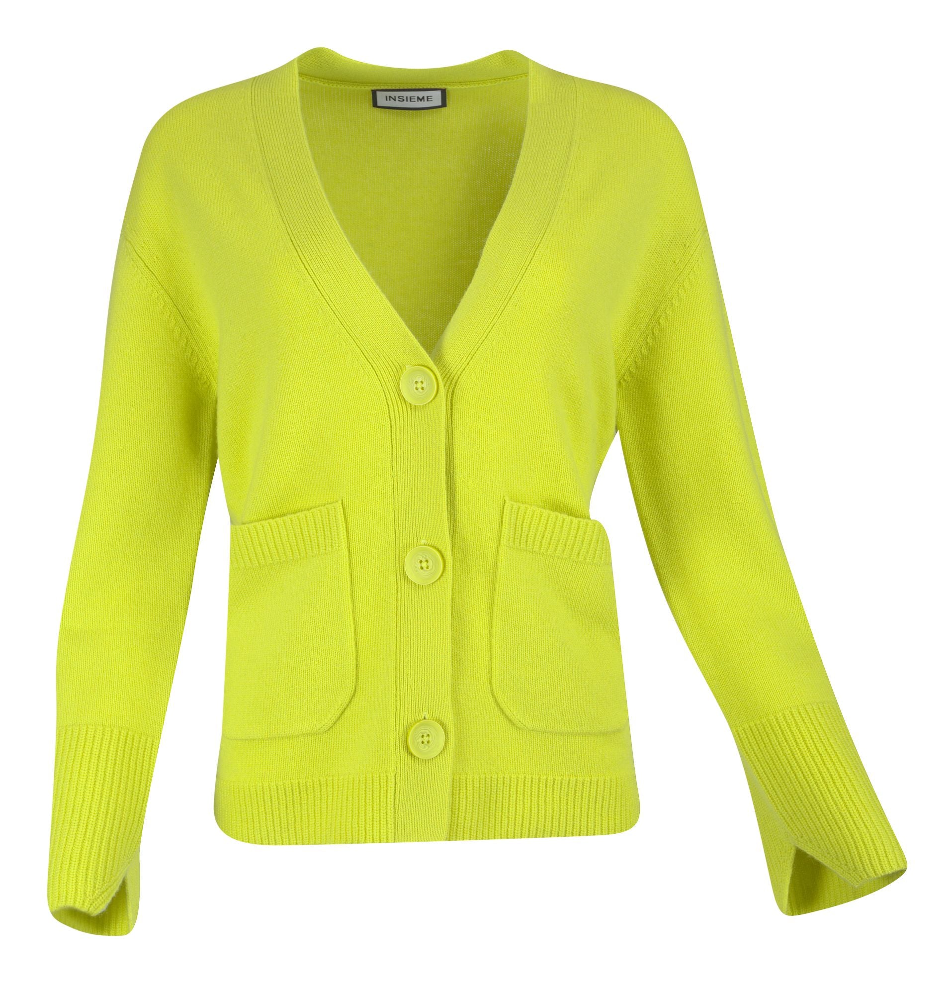 Strickjacke, Zwei Taschen, Knopfverschluss, V-Ausschnitt, Gerippt an den Taschen, Saum und Ärmelenden FarbecitricMaterial Wolle Cashmere Suchfarbegelb
