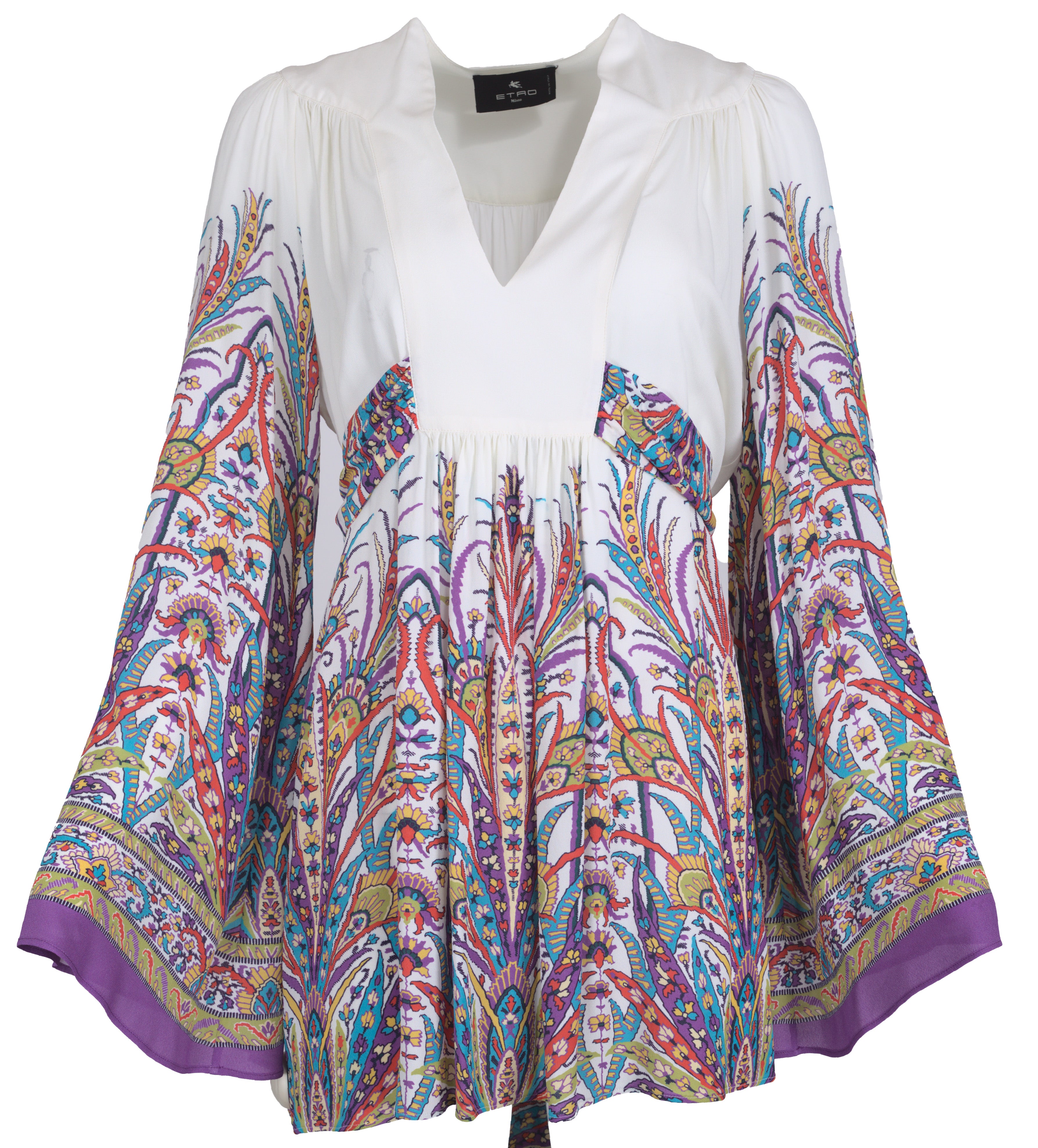 Schlupf Tunika mit Bindegürtel V-Ausschnitt, Trompetenarm, Pacely Druck, Viskose, ecru/bunt