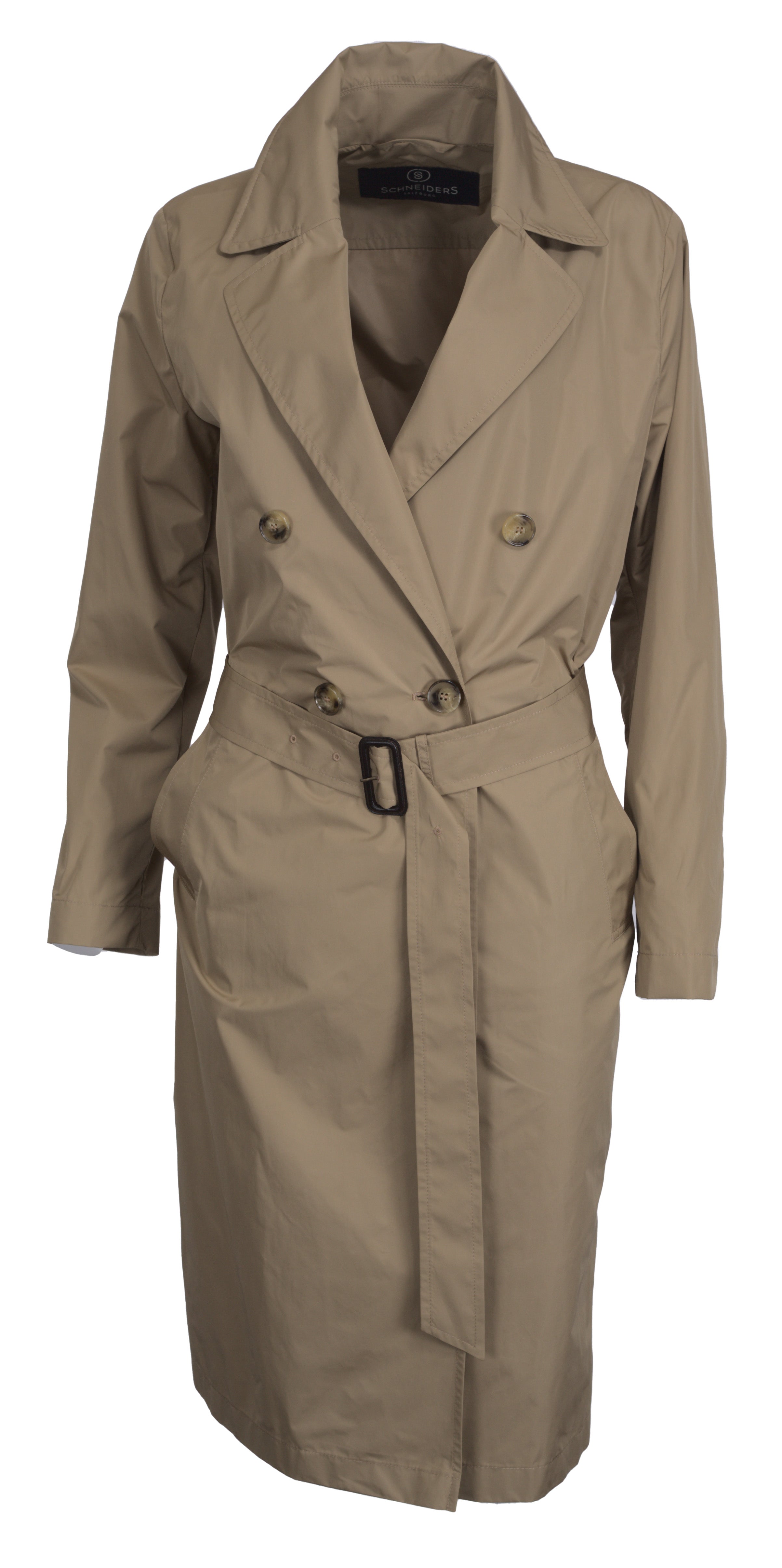 Trenchcoat, Revers-Kragen, Zwei-Reiher-Knöpfe, Zwei Eingriffstaschen, Stoffgürtel auf Taillenhöhe, Eine Innentasche