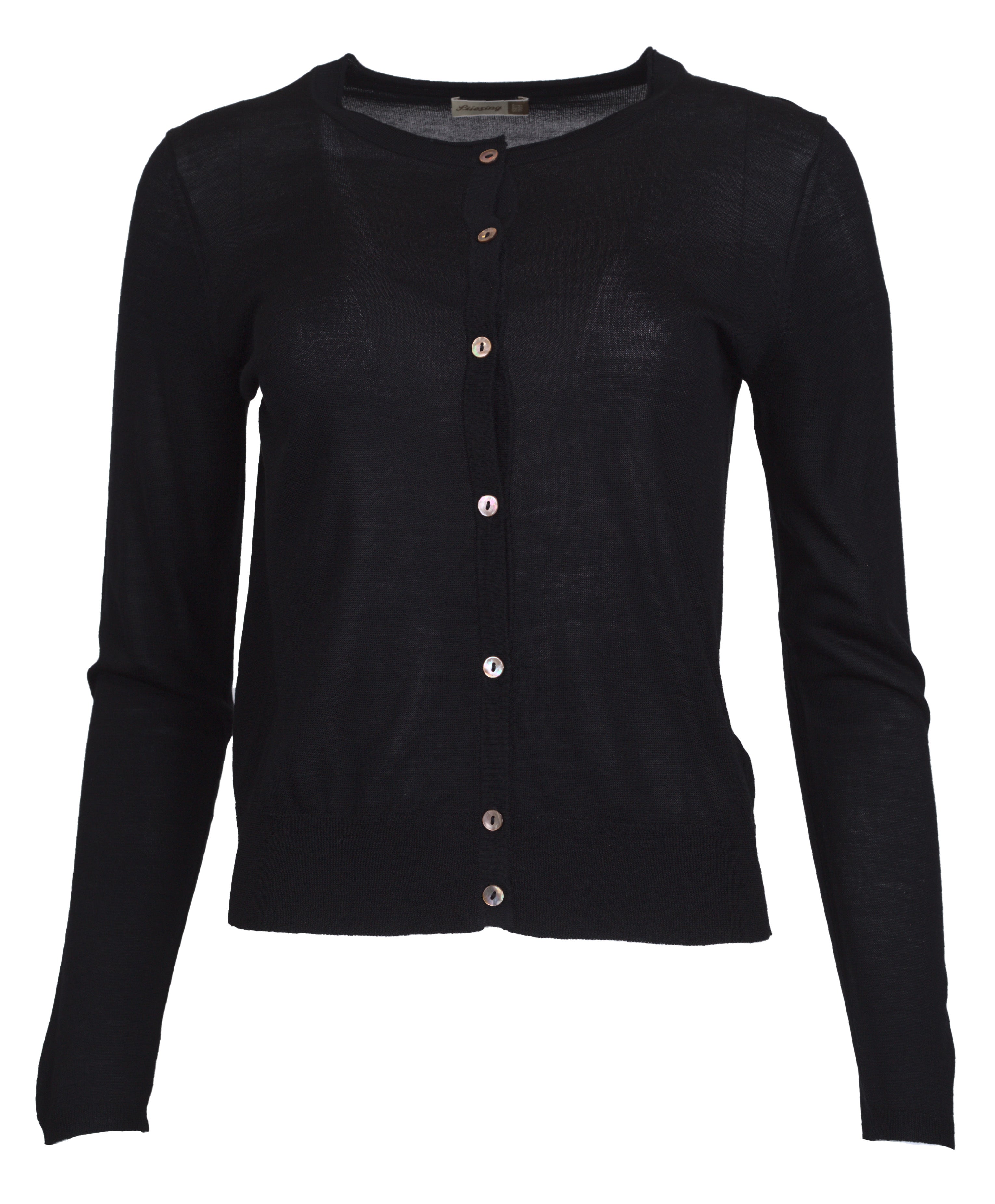 Strickjacke, Langarm, Knopfverschluss, Gerippt am Ausschnitt, Saum und Ärmelenden, Rundhalsausschnitt FarbeschwarzMaterialSeide und CashmereSuchfarbeschwarz