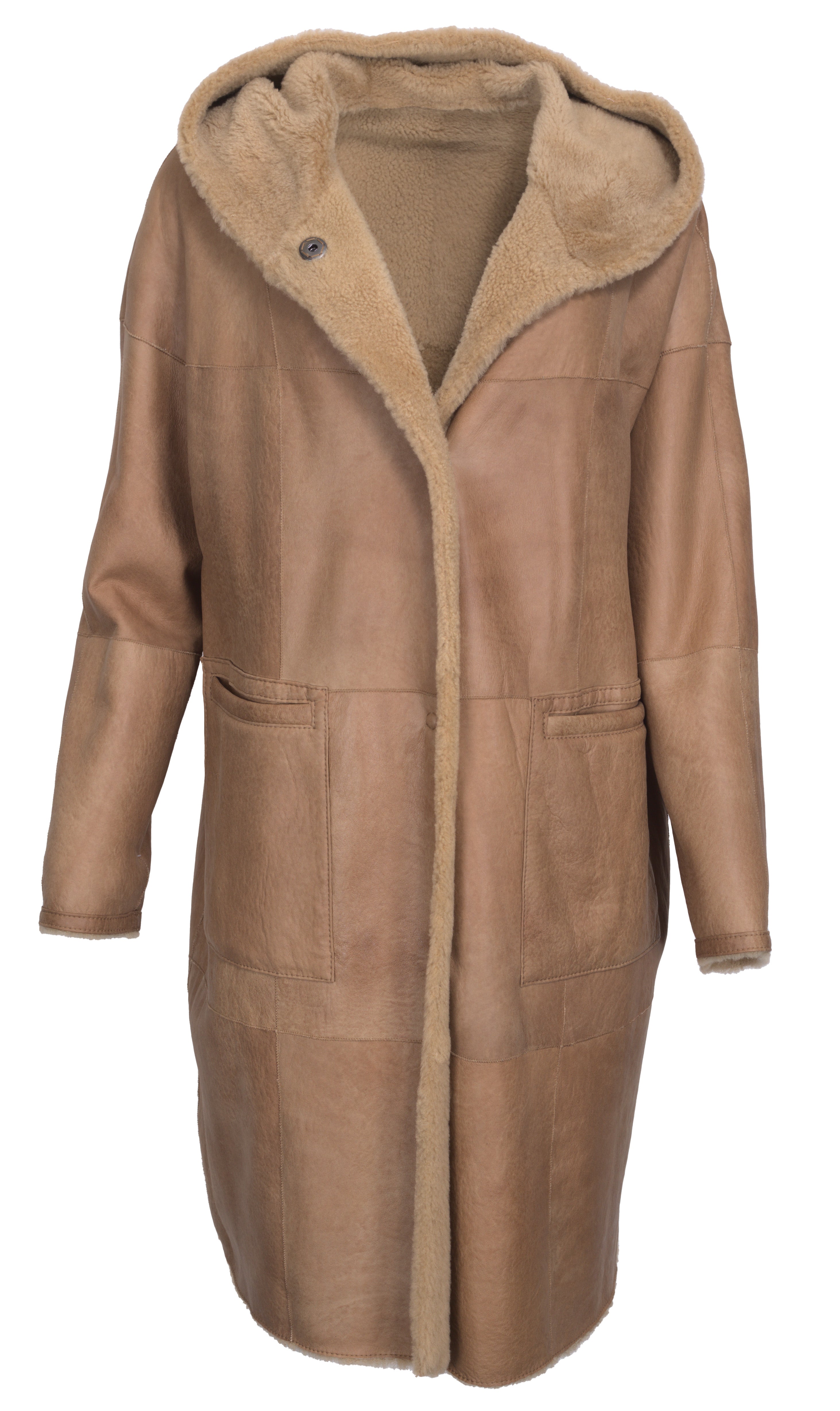 Wendemantel, Zwei Taschen auf Lederseite, Kapuze, Druckknopfverschluss